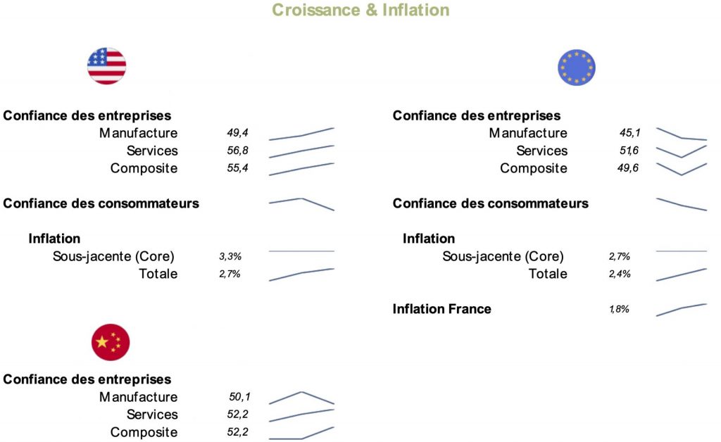L’année 2024 a été marquée par plusieurs tendances notables : une économie américaine robuste (surpassant largement l’Europe), une industrie manufacturière mondiale à la peine (pénalisée par des taux d’intérêt élevés et par des surcapacités en Chine) et des services mieux orientés, une situation qui se reflètent dans les prix (une stabilité des biens, exposés à la déflation chinoise, et une hausse significative des prix des services).