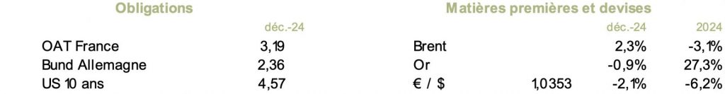 • Enfin, les crises politiques en France et en Allemagne ont également pesé sur la confiance des investisseurs, entraînant des flux de capitaux moins importants vers l’Europe. Le CAC 40, ainsi affecté par l’instabilité politique et les menaces de surtaxation des entreprises françaises, a reculé de 2%.